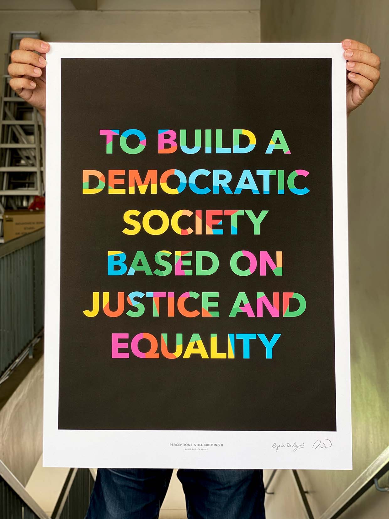 This print is an Hors Commerce edition of Still Building, a text work developed for the National Gallery Singapore’s National Day Light Up and projected onto the Gallery’s Padang Atrium Canopy between 24 July and 30 August 2020.
