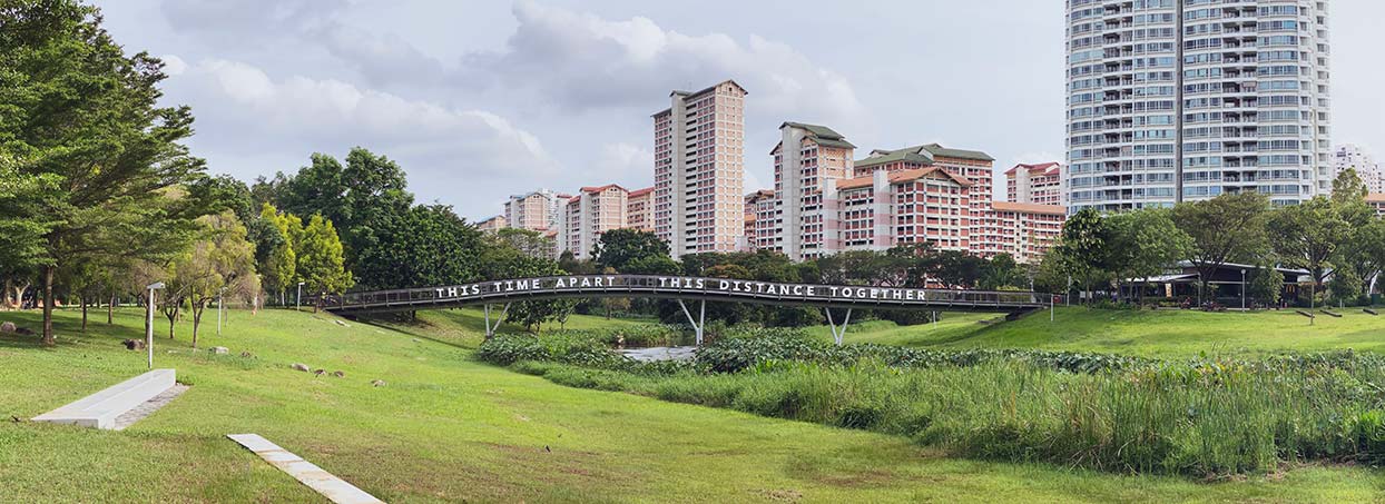 Conceptualised during Singapore’s 2020 ‘circuit breaker’ lockdown period, This Time reflects on our heightened sensitivities toward time, distances and proximities. The artwork features two sets of texts on both sides of the bridge near the Riverside Gallery.