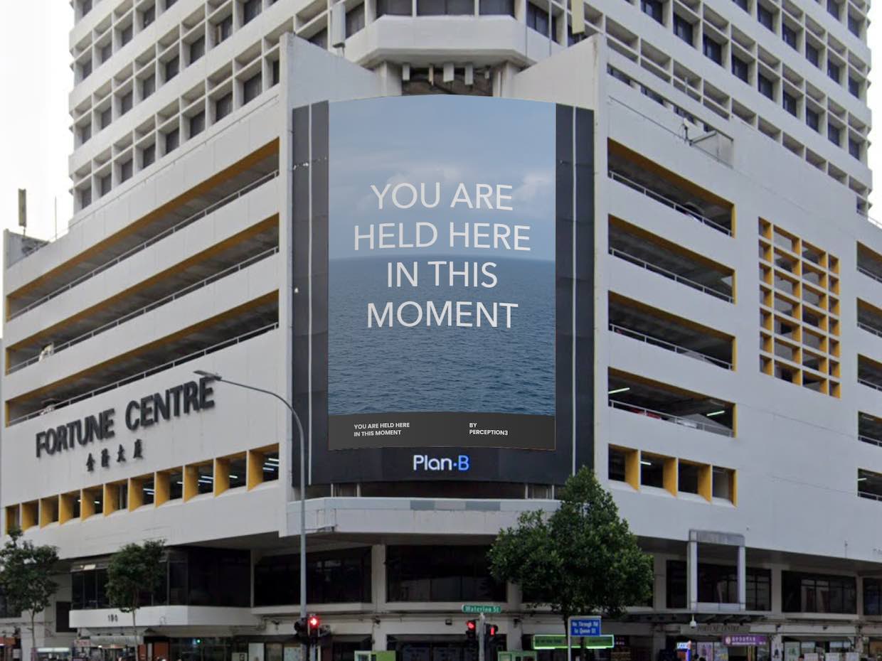 Conceptualised as companion pieces, You are held here in this moment and You will not feel this way forever expand on an ongoing exploration of text and the architecture of public space. In each piece, fragments of the title text unfold over digital video footage that had been captured while sailing across the South China Sea. Placed on monumental digital screens, the works engage with the affect of advertising and its promise of comfort and security, as well as with the poetics of space and time, which point to the inevitability of motion and change. On the one hand, the videos point to the spectacle of urban screens but also offer suspension; a shared moment of tender contemplation amidst the flux of the city.